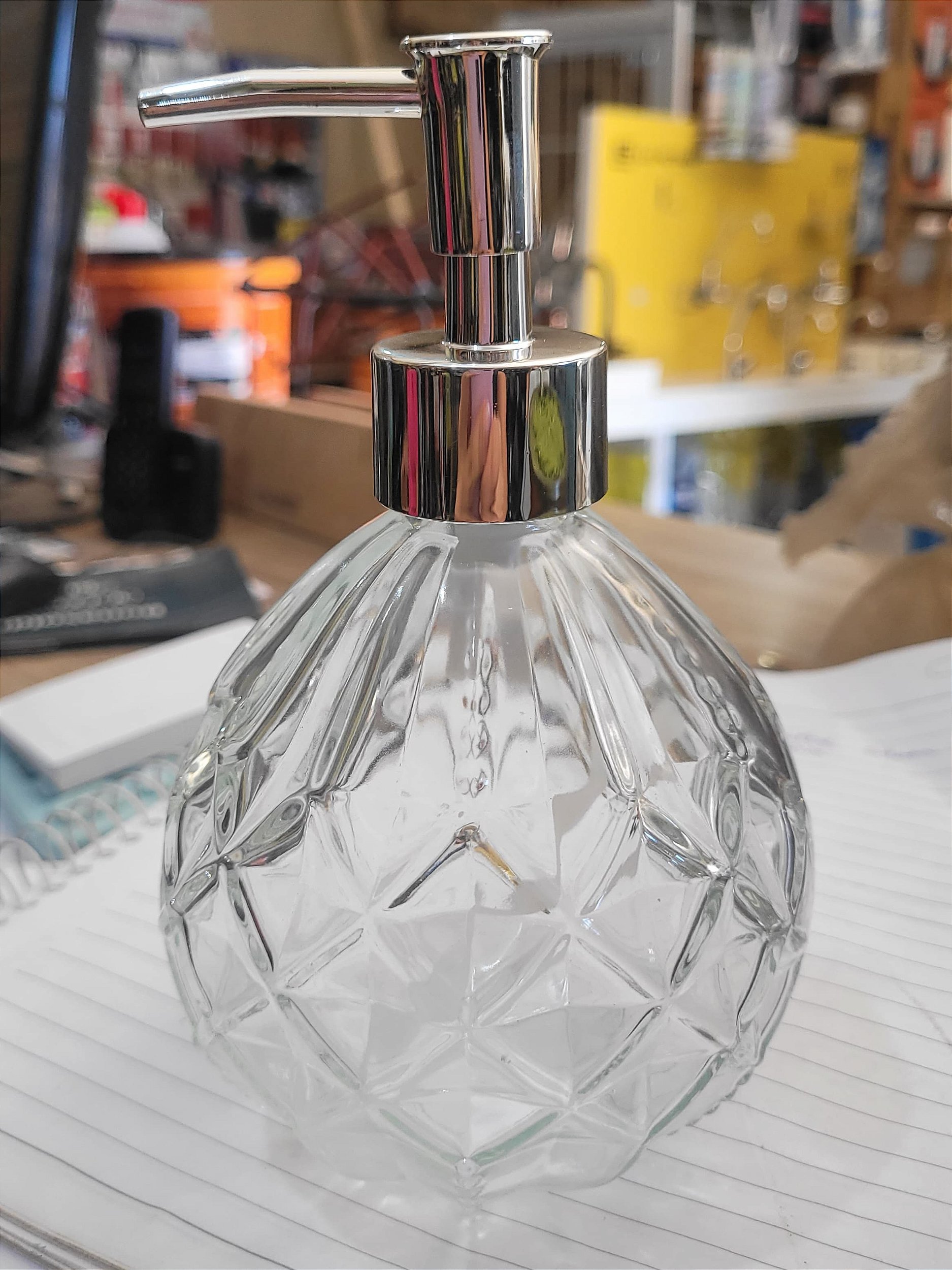 Porta Sabonete Líquido de Vidro transparente modelo Diamante. Capacidade 400ml.
