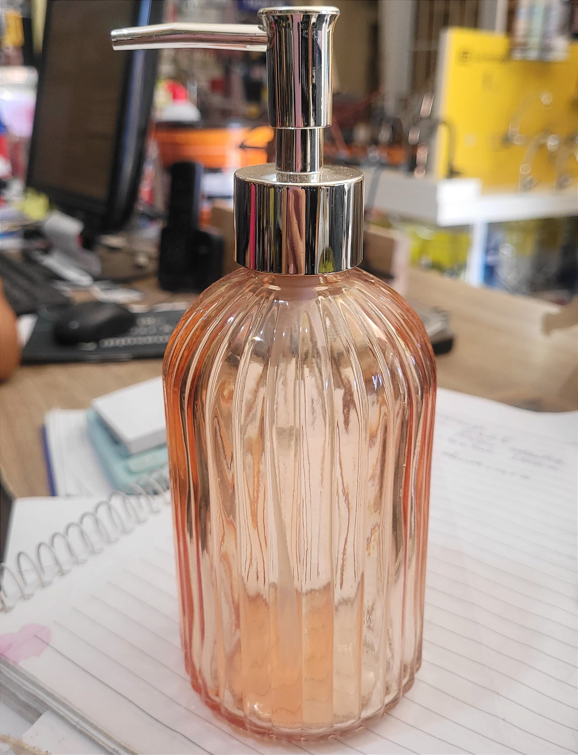 Porta Sabonete Líquido de Vidro, na cor Ambar, modelo Liege. Capacidade 400ml.